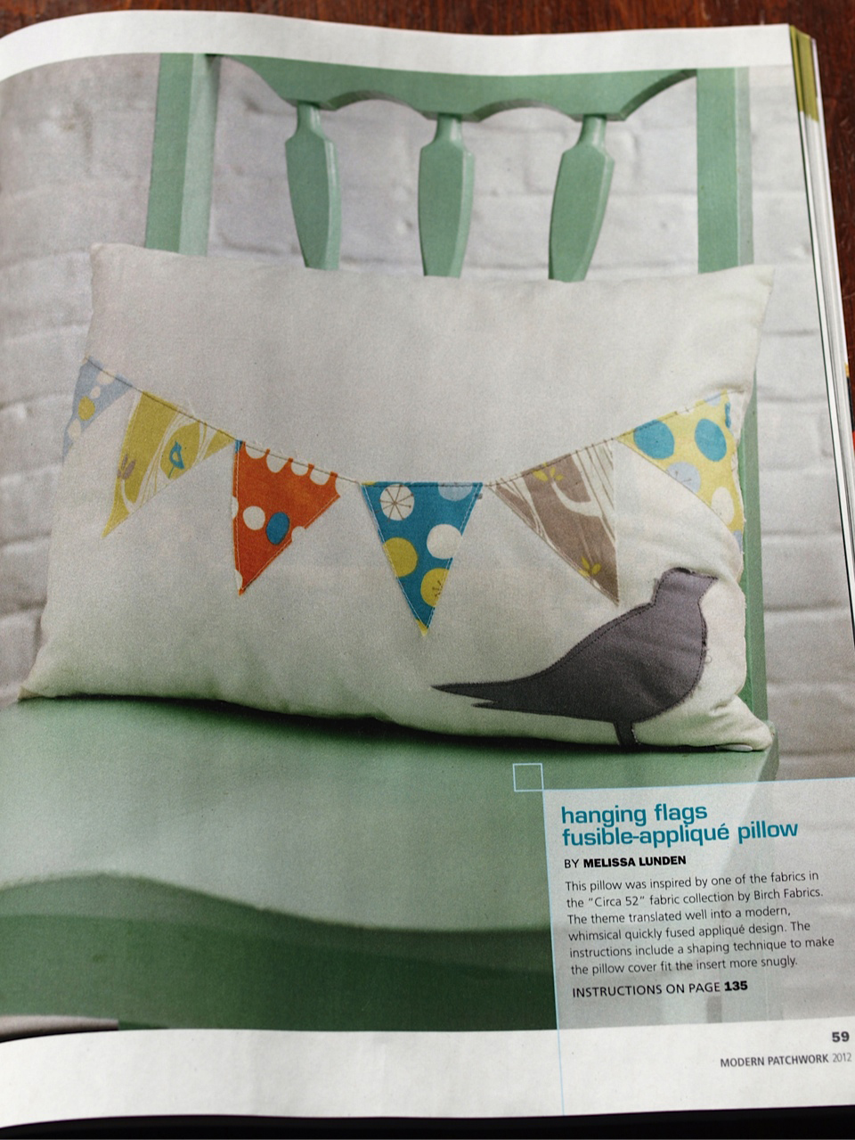 Please join us in congratulating our ever-so-talented seamstress, Melissa Lunden for her accomplishments in having her pillow project chosen for Modern Patchwork Magazine! We are so excited for Melissa! We know how incredibly talented she is, of course since the majority of our samples at quilt market are all sewn up and often even dreamed up by Melissa! Here’s a pic of the cover and a peak at the pillow. You can buy the magazine here.