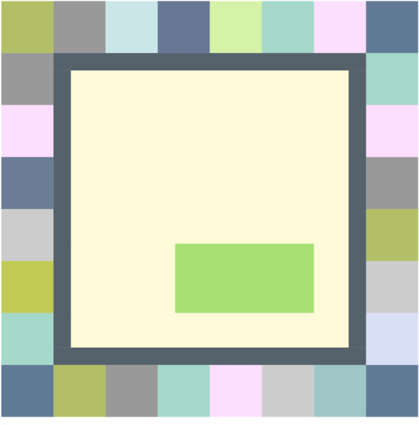 Arrange the 2″ squares around your center block with rows of 6 squares on either side of the block and 8 squares for the top and bottom. Once you are happy with the layout, sew the rows together and press the seams. Attach the rows of 6 squares to either side of the block and press seams.